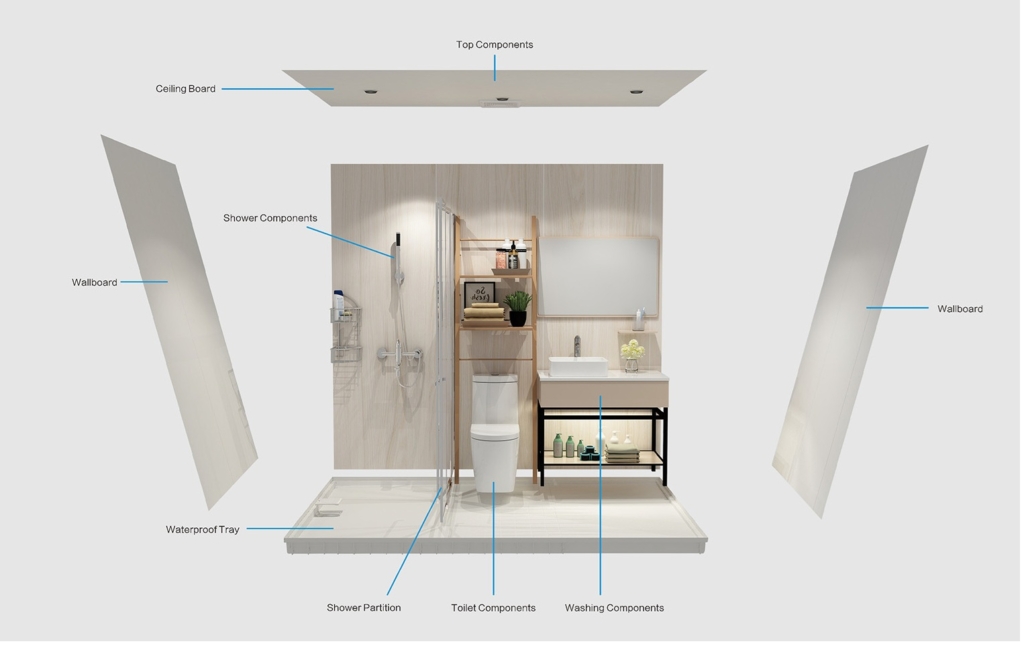 Η μονάδα μπάνιου είναι μια ανεξάρτητη υγειονομική μονάδα που υιοθετεί μια ενιαία αδιάβροχη βάση ή συνδυασμό αδιάβροχων βάσεων, σχηματίζει έναν ενιαίο χώρο με τον τοίχο και την οροφή και είναι εξοπλισμένη με διάφορα λειτουργικά υγειονομικά είδη. Στον περιορισμένο χώρο, μπορεί να πραγματοποιήσει πλύσιμο, ντους, μακιγιάζ, τουαλέτα και άλλες λειτουργίες, με αξιόπιστη ποιότητα, αδιάβροχη προστασία από διαρροές, εύκολη εγκατάσταση, ενιαίο συνολικό στυλ και άλλα χαρακτηριστικά.